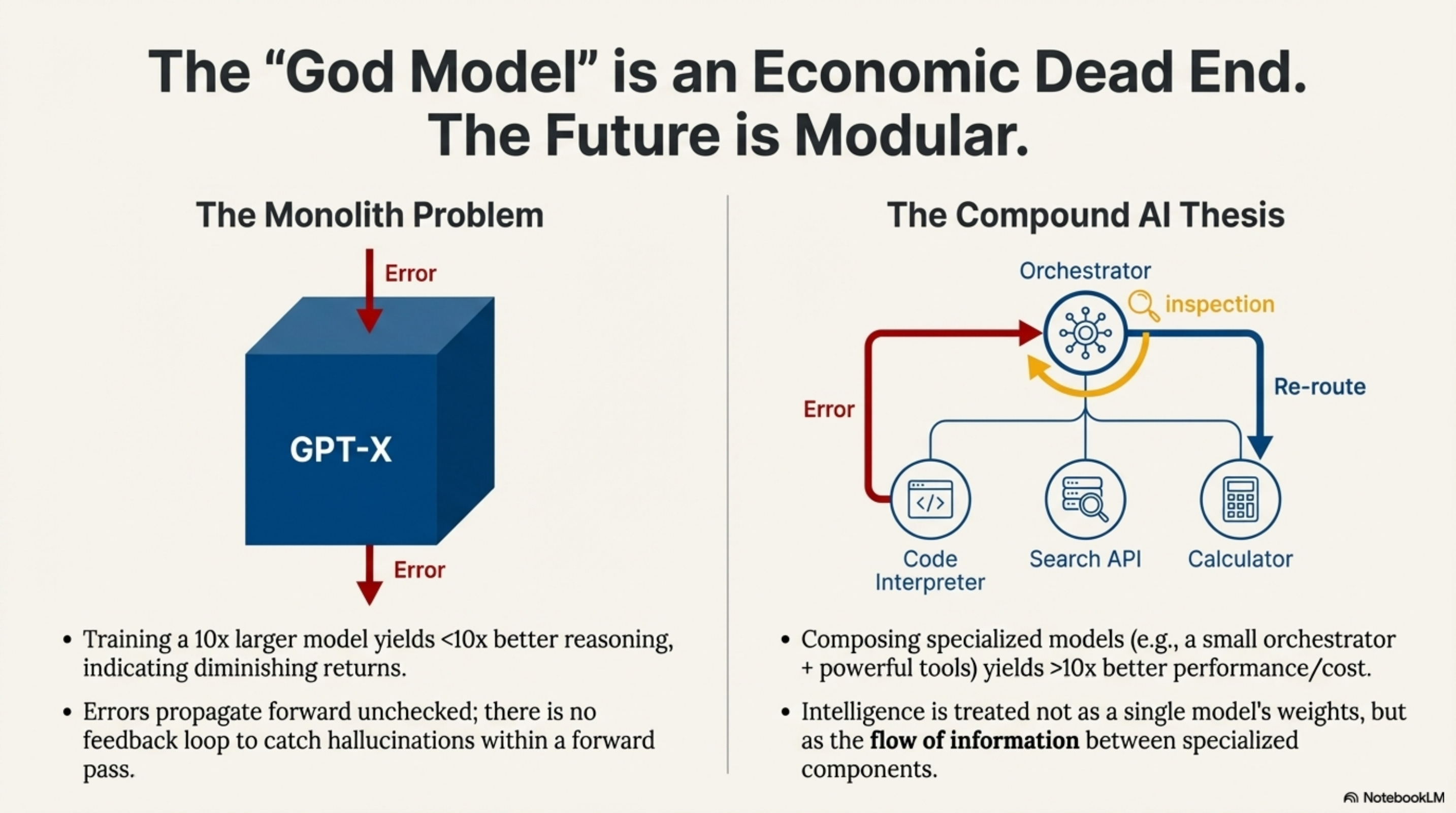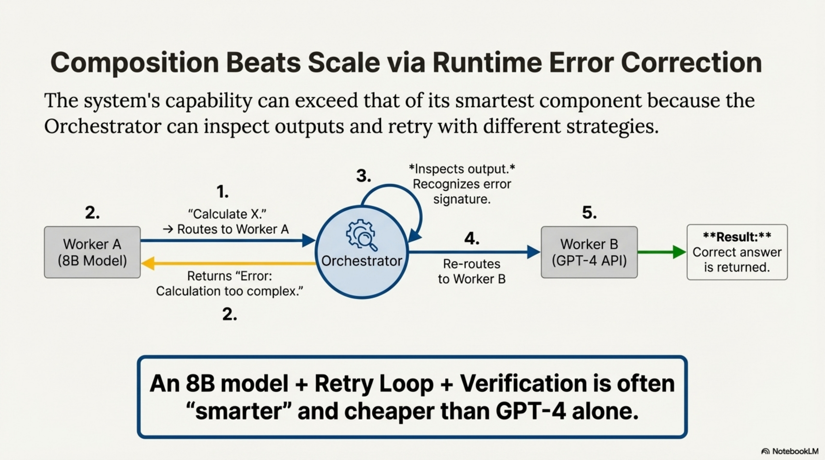In a monolith, if one layer hallucinates, the error propagates forward with no feedback loop to “catch” it. In a compound system, the Orchestrator inspects the output of Worker A. If it looks wrong, the Orchestrator routes to Worker B. This Runtime Error Correction extends the capability of the system beyond the capability of its smartest component. The 8B model is “dumber” than GPT-4, but 8B + Retry Loop + Verification Tool is often “smarter” than GPT-4 (Zero Shot).
