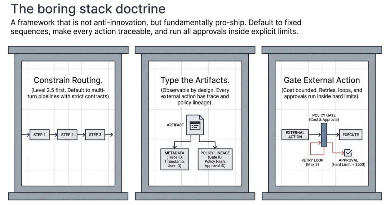 That doctrine maps to three operating pillars: Level 2.5 first, default to fixed-sequence multi-turn pipelines with strict contracts or artifacts. Observable by design, every external action has trace and policy lineage. Cost bounded, retries, loops, and approvals run inside explicit limits. That doctrine is not anti-innovation. It is pro-ship.