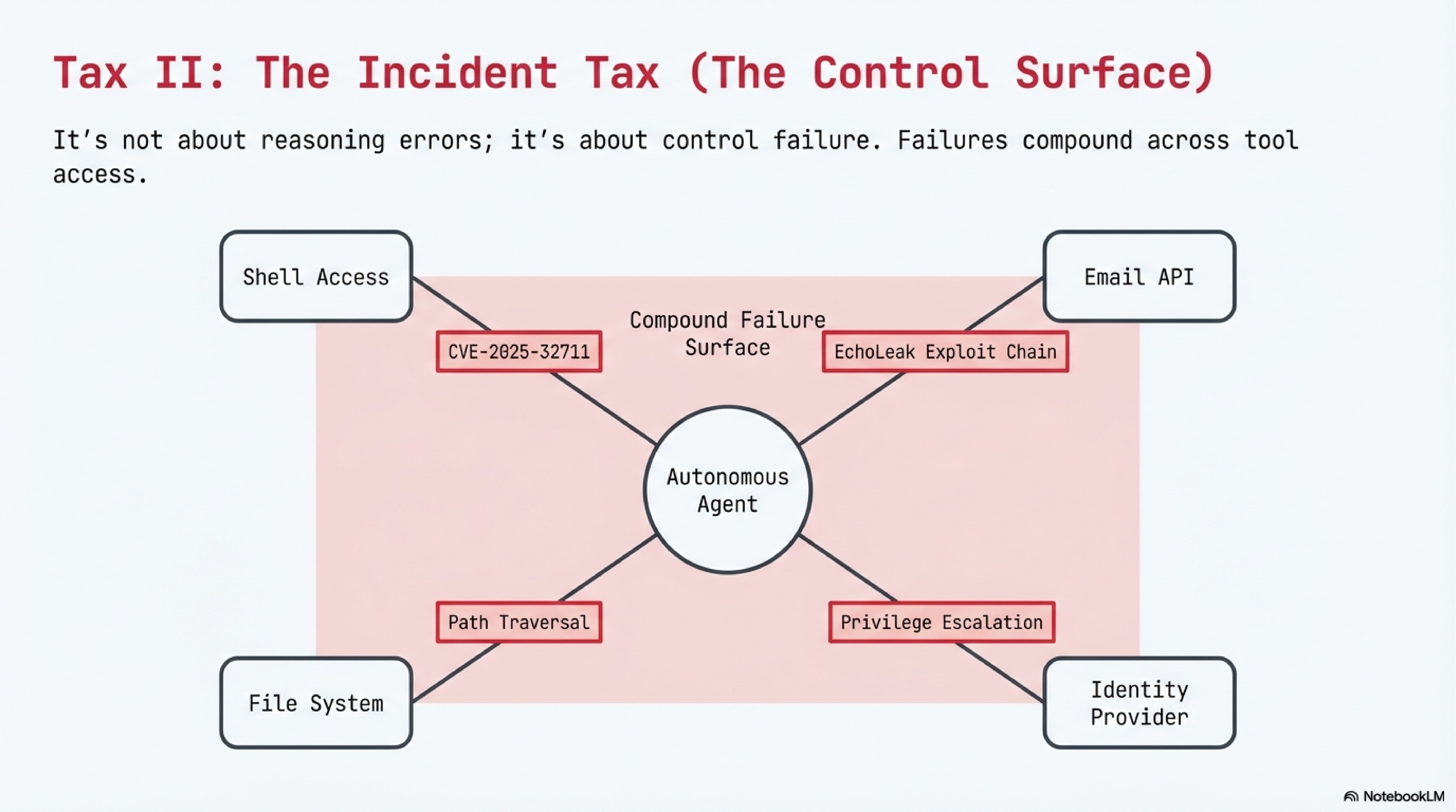 In every case, the failures were in the control layer, spending limits, input sanitization, privilege boundaries, state verification, not in the model’s reasoning. The Incident Tax scales with autonomy level, and the relationship isn’t linear. It’s combinatorial, because failures compound across tool access, persistent state, and multi-party communication.