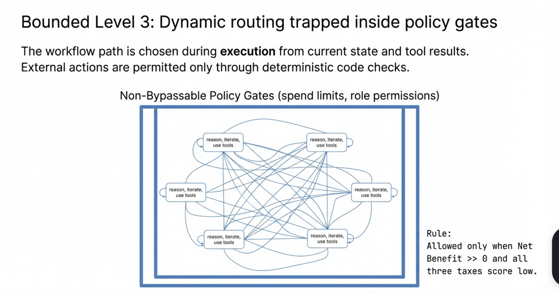 Bounded Level 3 allows runtime dynamic routing, but external actions are permitted only through non-bypassable policy gates, finite budgets, and mandatory escalation paths.