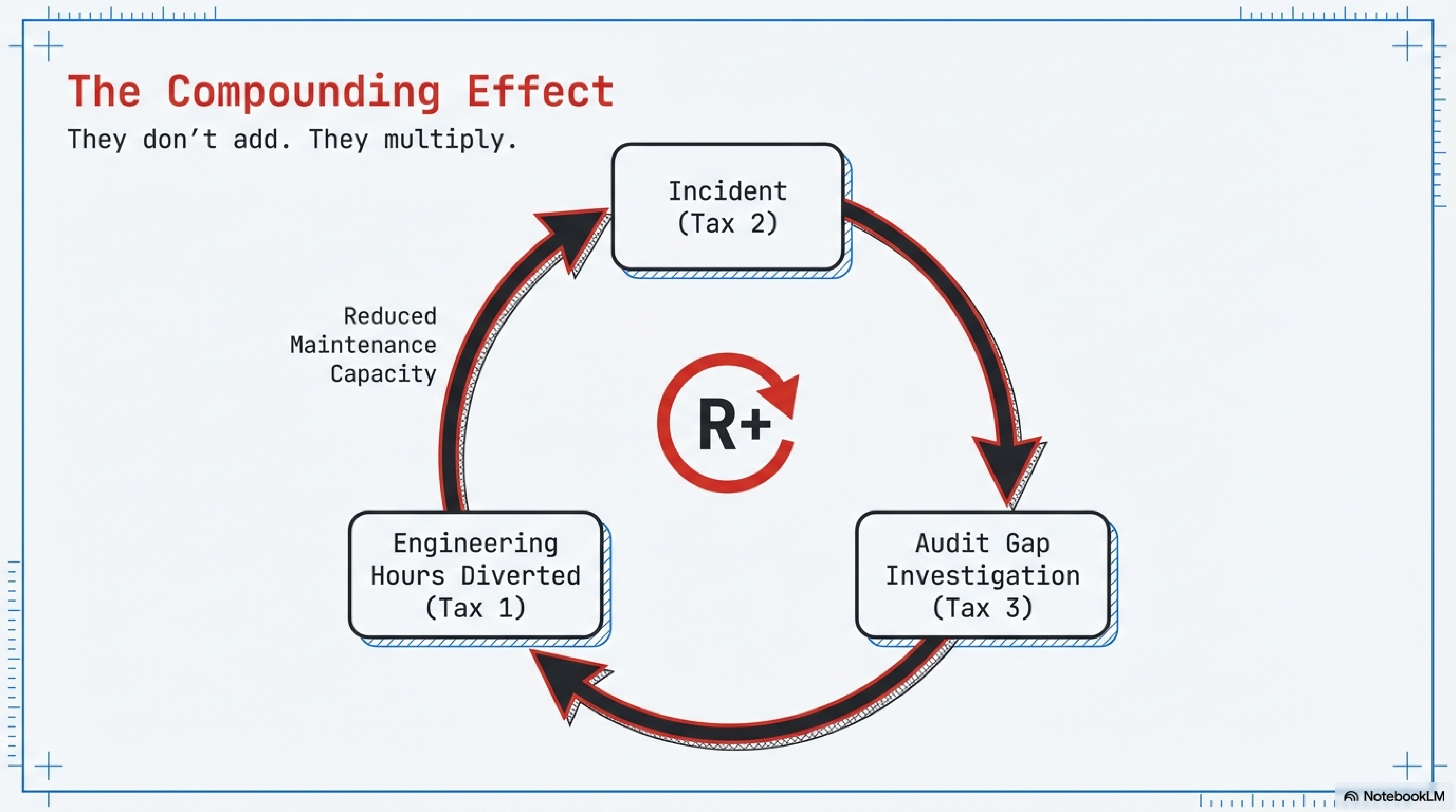 They don’t add, they compound. Here’s how: an incident (Tax 2) triggers an investigation, which reveals there’s no audit trail (Tax 3), which pulls your two best engineers off product work for a week (Tax 1). One failure, all three taxes, one event.