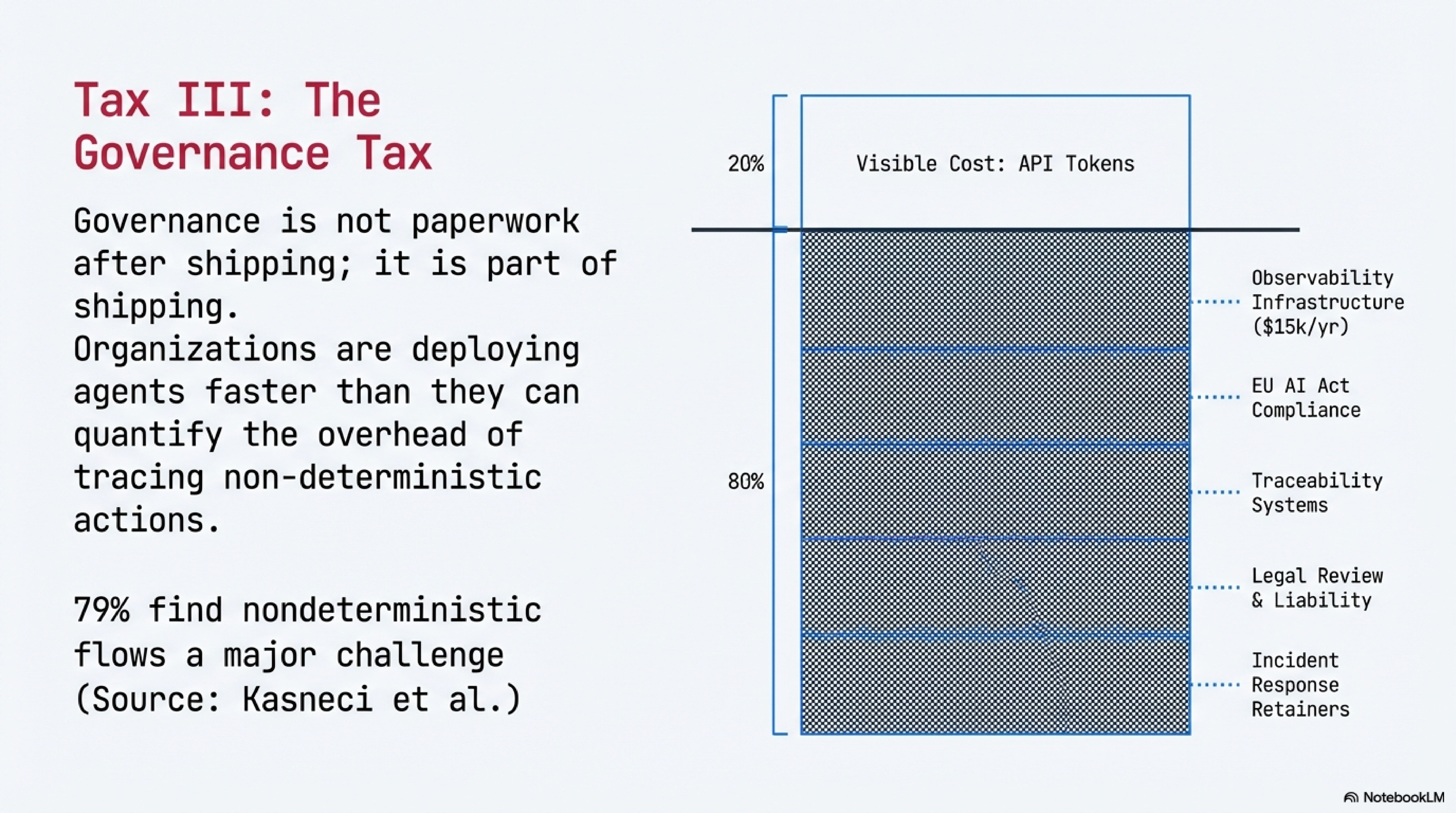 The Governance Tax has three components: regulatory compliance (the EU AI Act entered into force August 2024, with staged application through 2027[17]), observability infrastructure (tracing, token accounting, and action logging, tooling alone runs $5,000–$15,000/year for a mid-size team before integration engineering[18A,18B]), and expert staffing, the compliance, legal, and security personnel whose costs no published study has quantified. The measurement gap is itself a core finding: organizations are deploying agents faster than they can quantify the governance overhead.