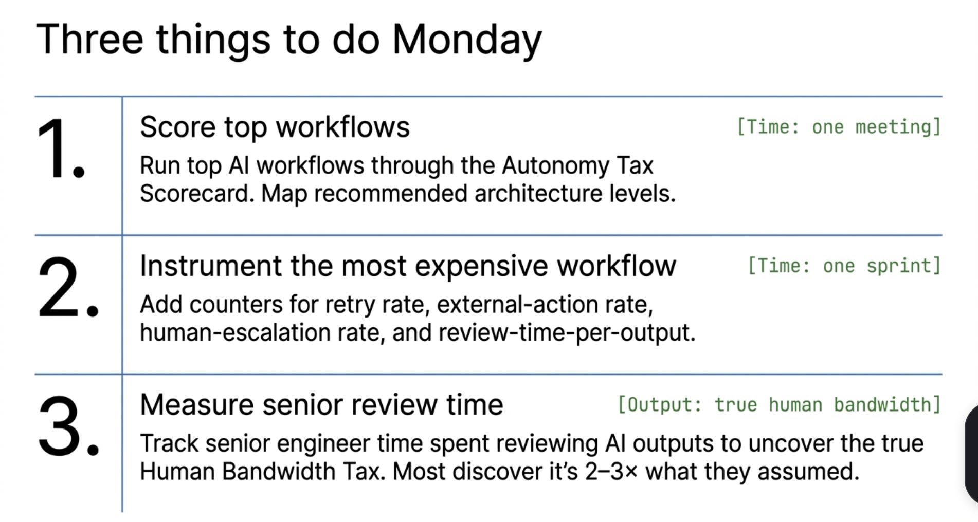 1. Score your top three workflows. Start with the workflows where you’re already considering or piloting AI assistance. Rank by monthly human-hours spent. Run each through the Autonomy Tax Scorecard. Output: a one-page ranked table with a recommended architecture level for each. Time: one meeting.