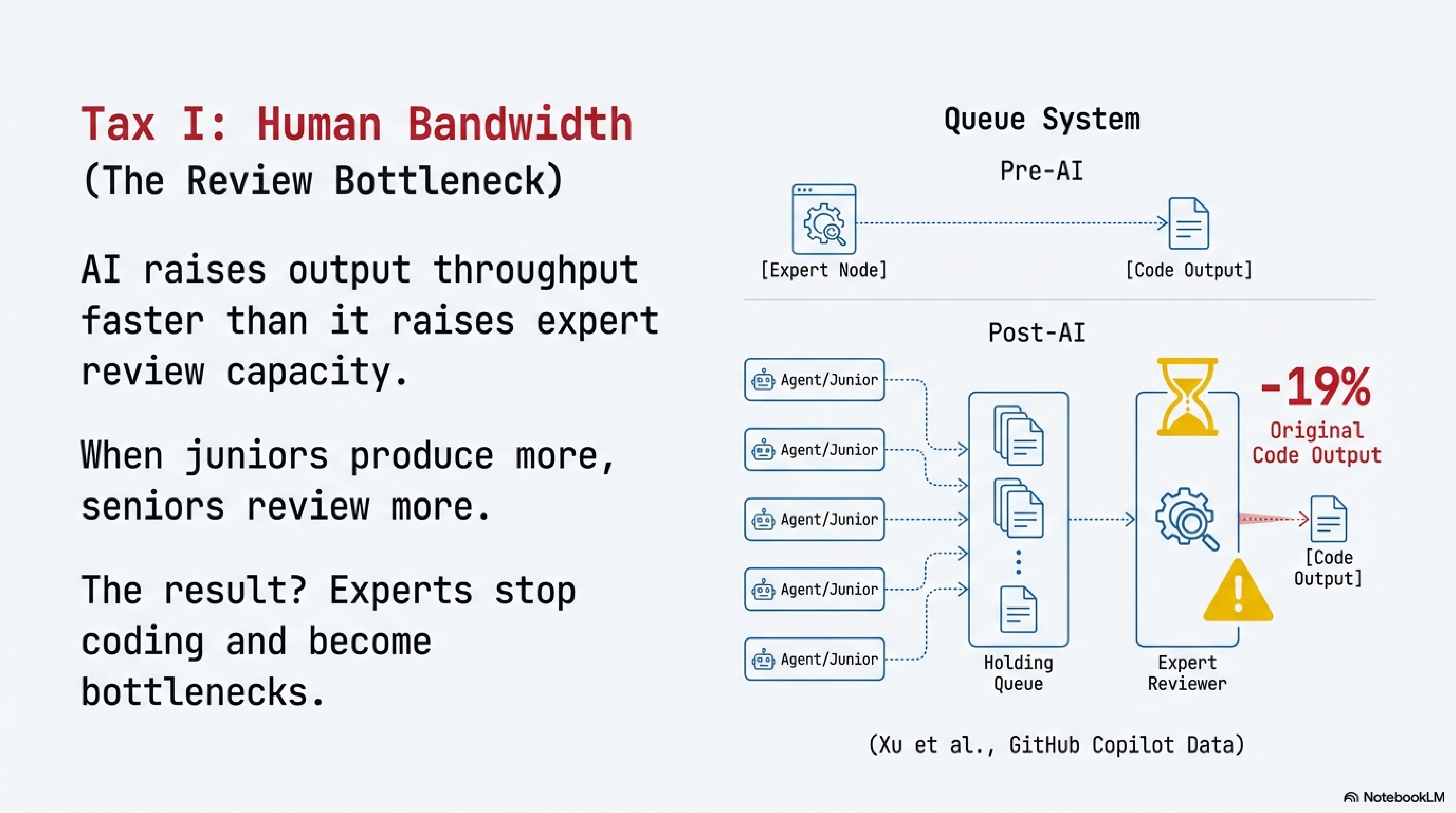 Three independent contexts, same structural pattern: AI amplifies junior output, expert review becomes the bottleneck, and the net effect depends on team composition. If your organization has many novices and few experts, the common shape of most enterprise teams, the Human Bandwidth Tax is highest.[11]