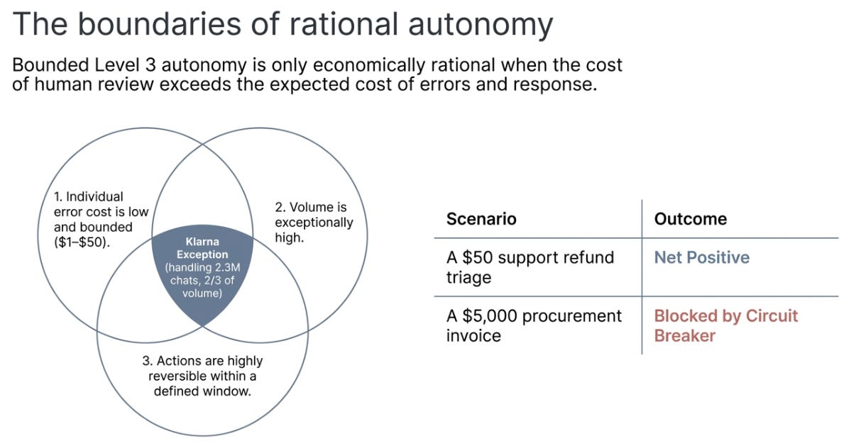 Bounded Level 3 autonomy can be economically rational even with immature controls when three conditions hold simultaneously: (1) individual error cost is low and bounded, (2) volume is high enough that human review would cost more than errors do, and (3) actions are reversible within a defined time window.