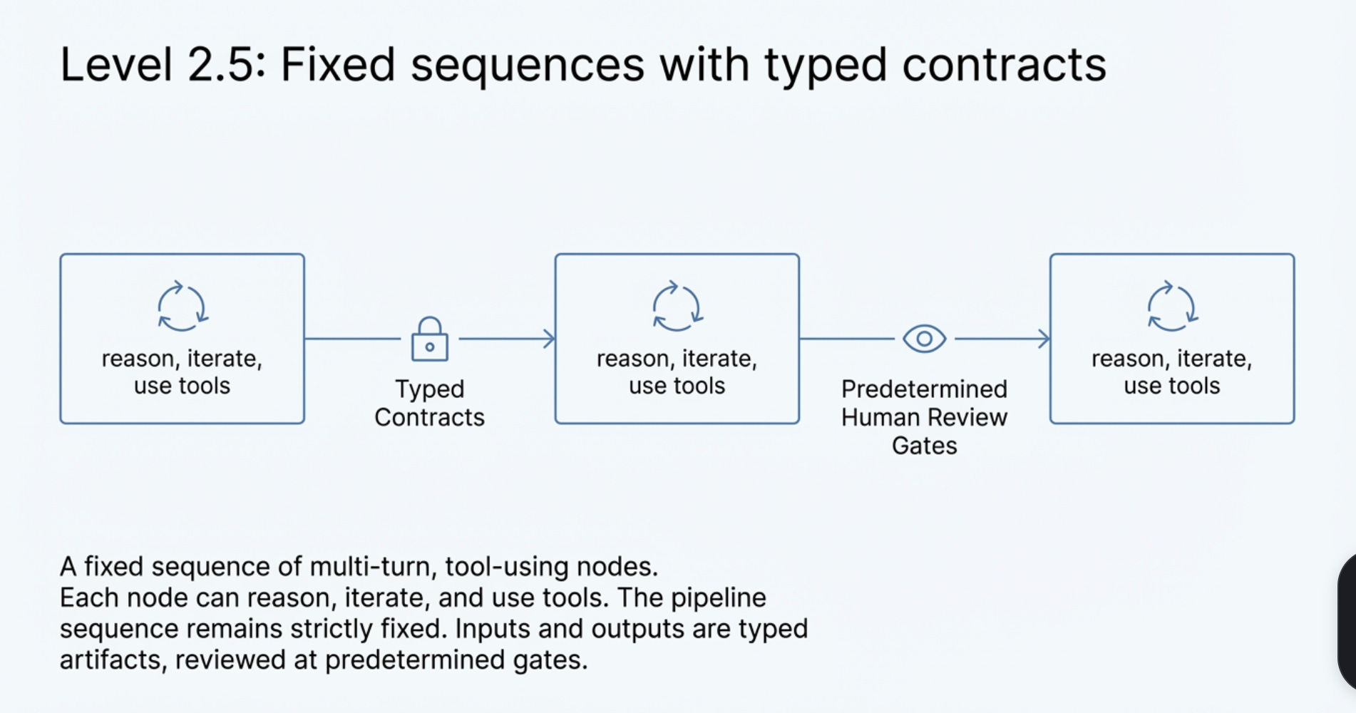 We call this middle ground Level 2.5 Autonomy: a fixed sequence of multi-turn, tool-using nodes where each node can reason, iterate, and use tools, but the pipeline sequence is fixed, each node’s inputs and outputs are typed contracts (or artifacts), and humans review at predetermined gates.