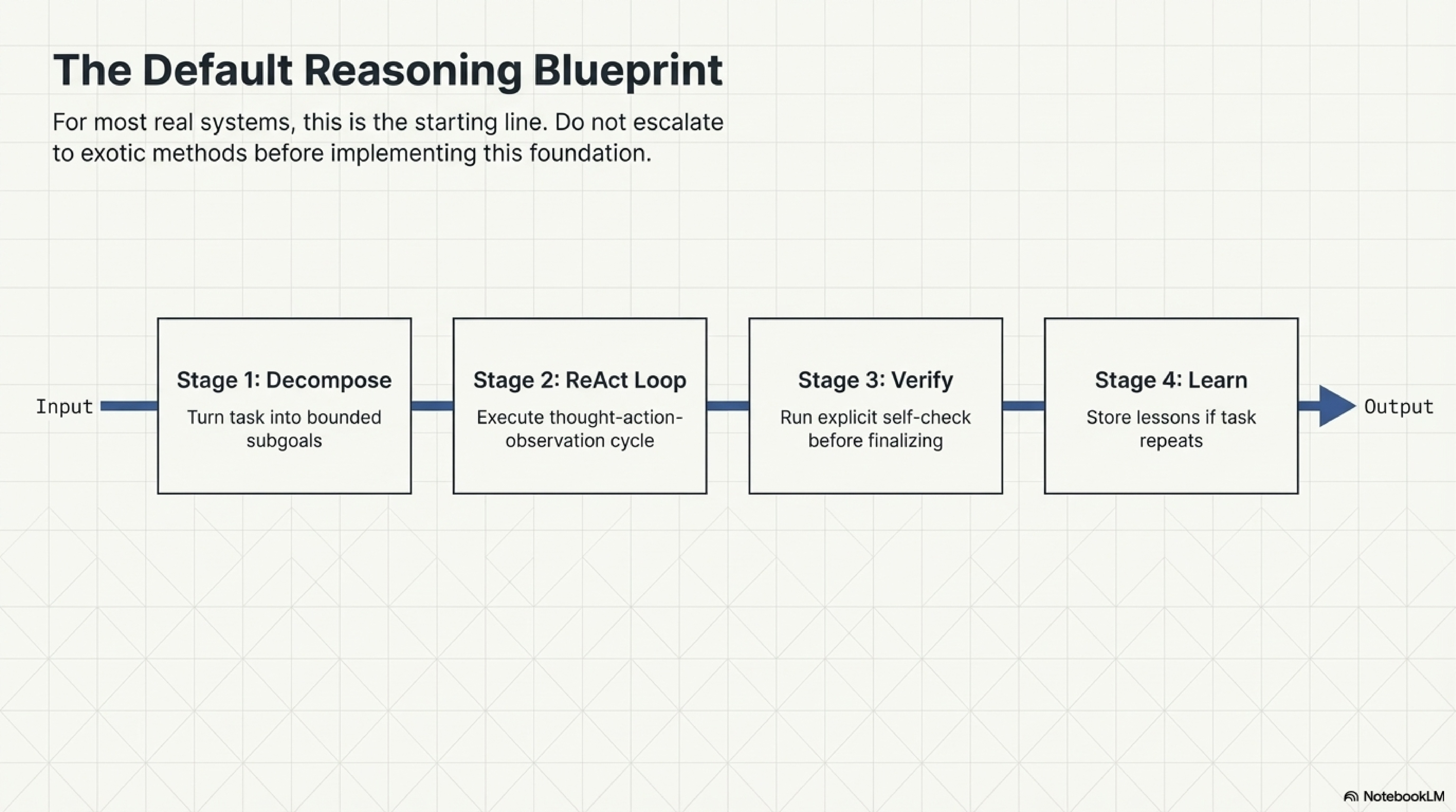 A useful methodology at this stage is therefore layered. Start by asking whether the baseline scaffold already separates subgoals and grounds the plan in observations. If it does, then inspect the remaining error. If the problem is a near miss, use local refinement. If the problem recurs across runs, preserve a lesson. If the problem is factual confidence without sufficient checking, isolate verification. This is the kind of structure that helps teams avoid randomly adding "reason harder" prompts to places where a different control is what the workflow actually needs.