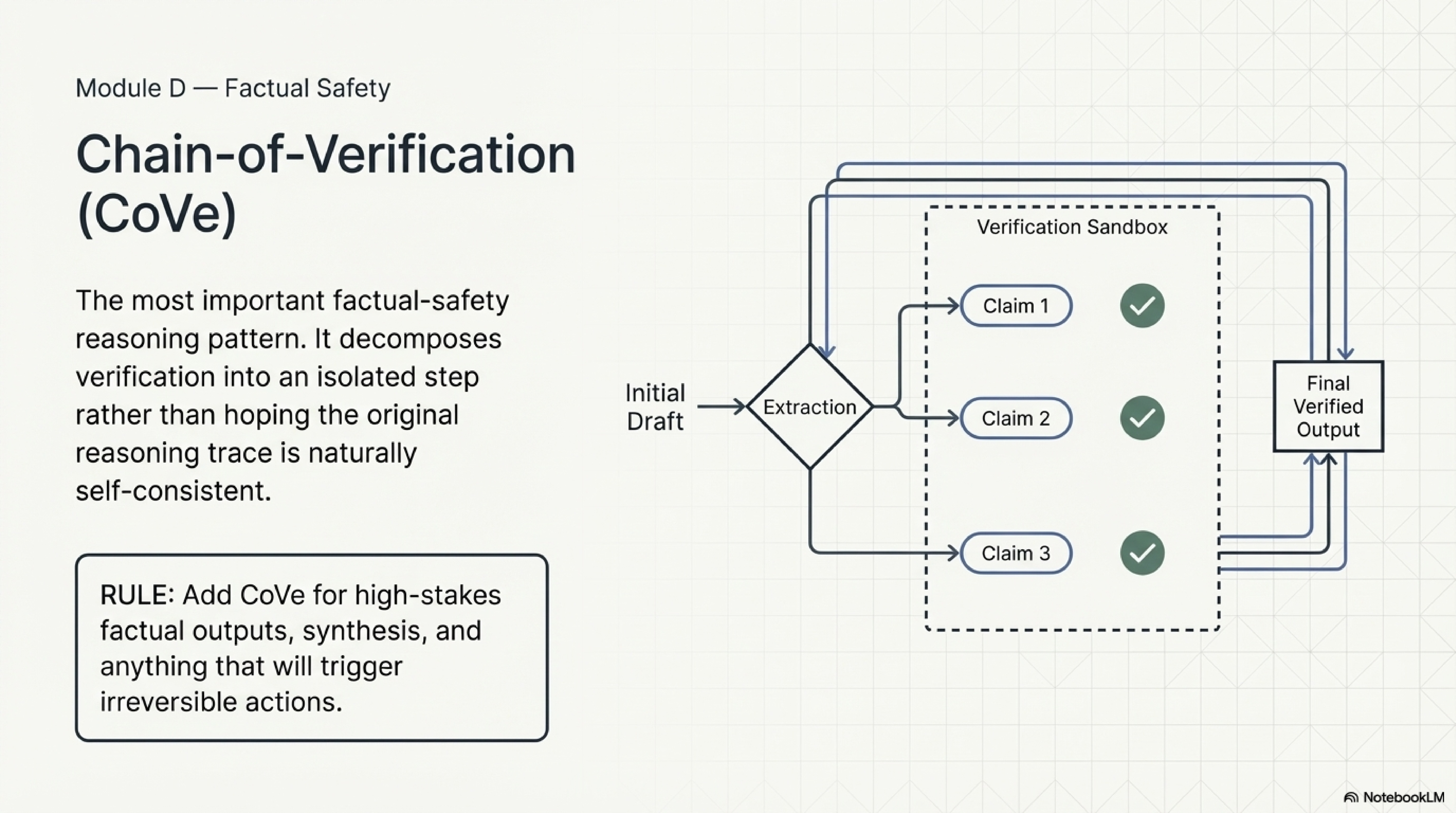 Verification is a third category and it should be taught separately because it solves a different problem. Chain-of-Verification is important because it does not ask the model merely to "be more careful." It separates generation from checking. Claims are identified, reopened in a fresh context, and compared against source material before the output is allowed to stand. This is the right pattern whenever unsupported factual claims can create real downstream cost. In course terms, this is one of the most important distinctions in the chapter: refinement improves a draft, reflection improves later attempts, and verification checks whether the claims should survive at all.