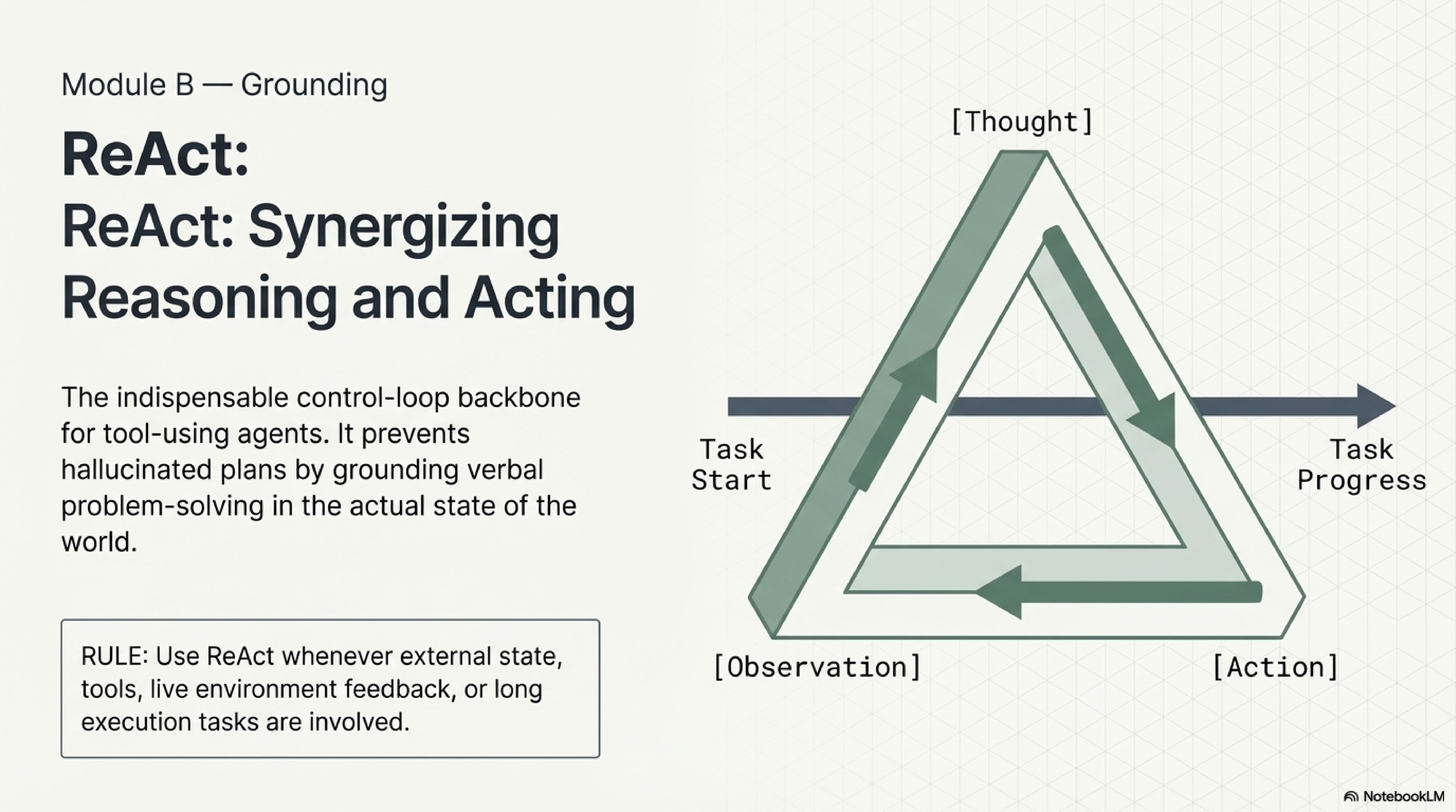 For agents that use tools, the baseline scaffold usually needs a second piece in addition to decomposition. It needs a loop that binds later reasoning to external feedback. ReAct remains so influential because it expresses this clearly: the model forms a thought, takes an action, observes the result, and then continues from the observed state rather than from its original assumption. The value of that structure is not stylistic. It reduces the chance that the workflow continues building on a mistaken internal picture after the environment has already contradicted it.