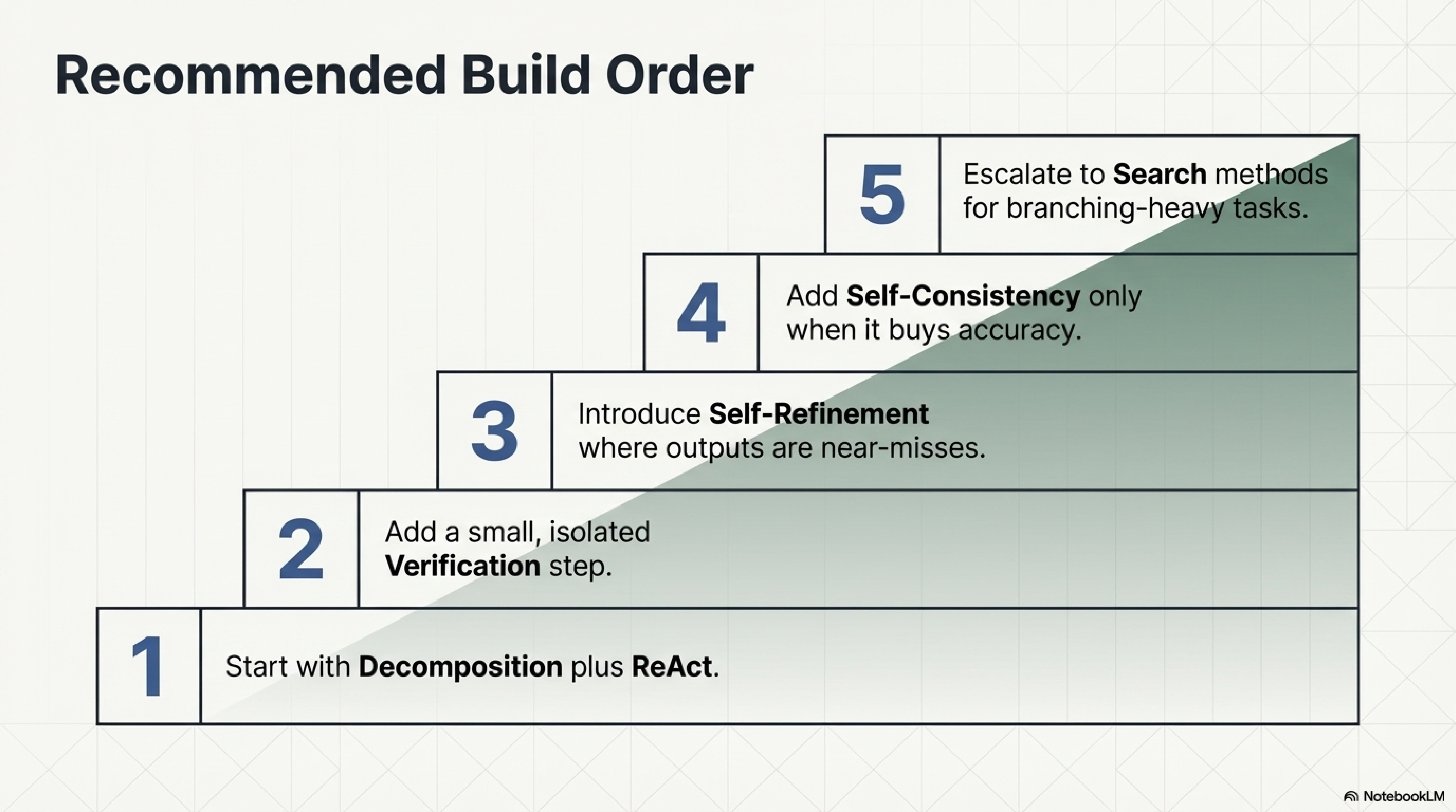 The build order that follows from all this is straightforward. Begin with decomposition and a thought-action-observation loop. Add verification before high-stakes outputs or irreversible actions. Add local refinement when the workflow is mostly right but misses in a bounded way. Preserve lessons when failure repeats across runs. Use self-consistency when single-trace variance remains high and latency budgets allow it. Escalate to formal or tree-shaped search only when simpler scaffolds have clearly failed on a genuinely branching problem.