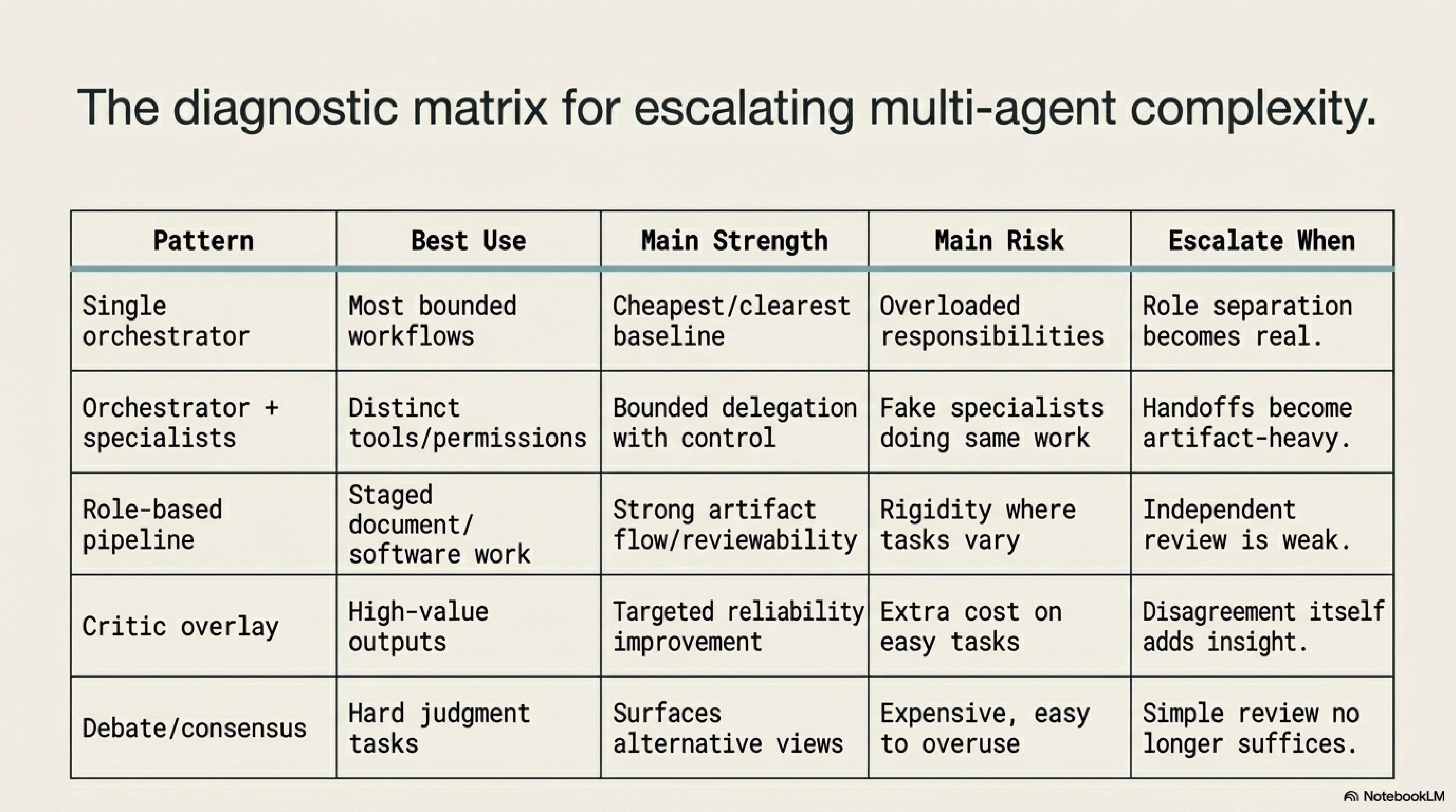 That staged build order helps the reader see what each level is buying. Orchestrator plus specialists buys role clarity. A pipeline buys artifact checkpoints and clearer debugging. A critic buys independent review. Debate buys multiple competing lines of reasoning when the task is genuinely ambiguous. The mistake is to jump straight to the top of the ladder for tasks that do not need it. When disagreement adds no information, a debate system is often an expensive substitute for a validator, a test suite, or a simpler review node.