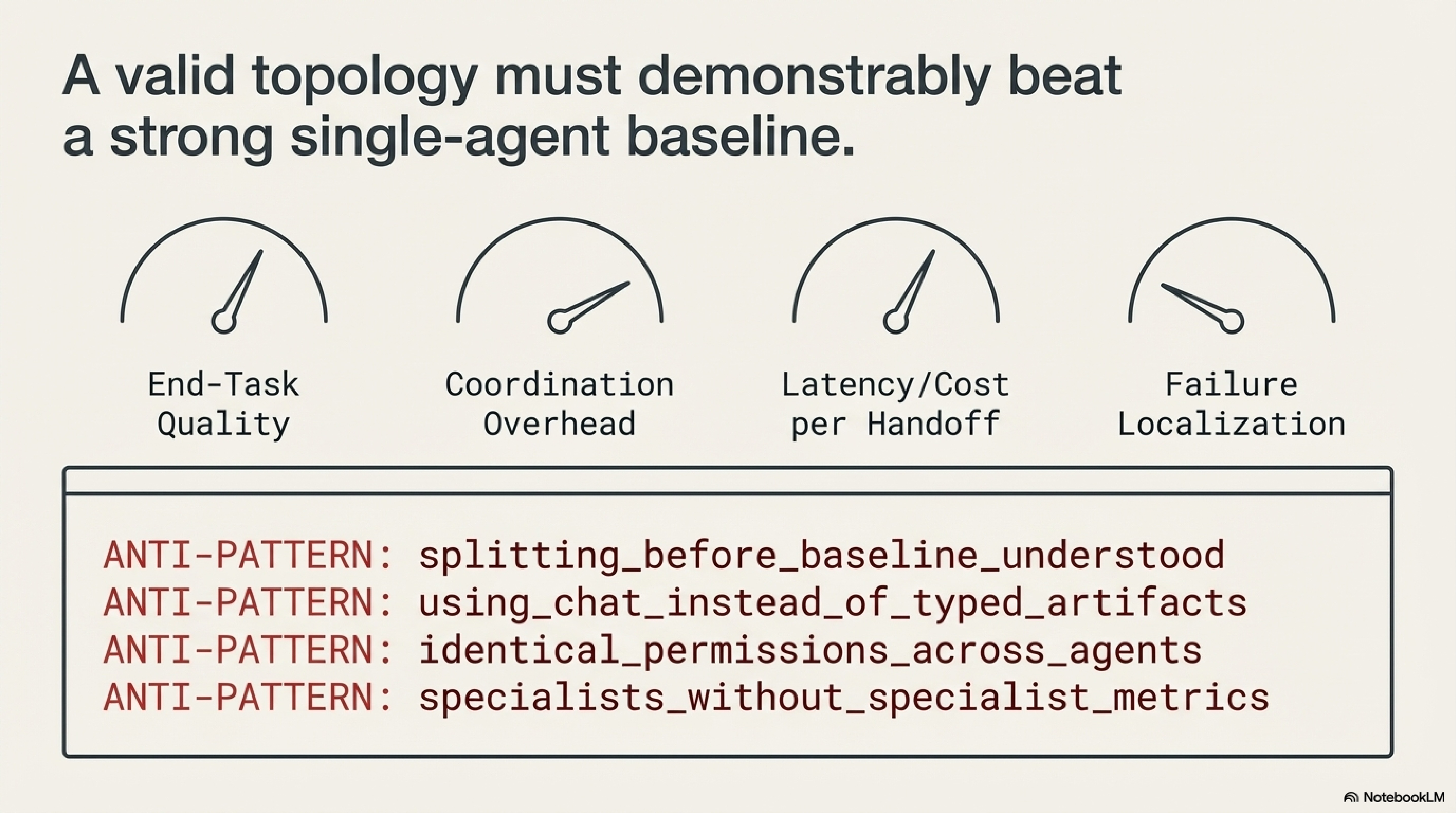 Once a multi-agent system exists, it should be evaluated more harshly than a single-agent baseline, not less. The first question is whether end-task quality improved. The second is whether the added topology preserved or improved latency, cost, and reliability enough to justify itself. The third, and often the most operationally important, is whether failure localization became easier. When the output is wrong, can the team inspect a bounded artifact and identify the first broken handoff, or do they have to read a long conversation and reconstruct the failure through inference.