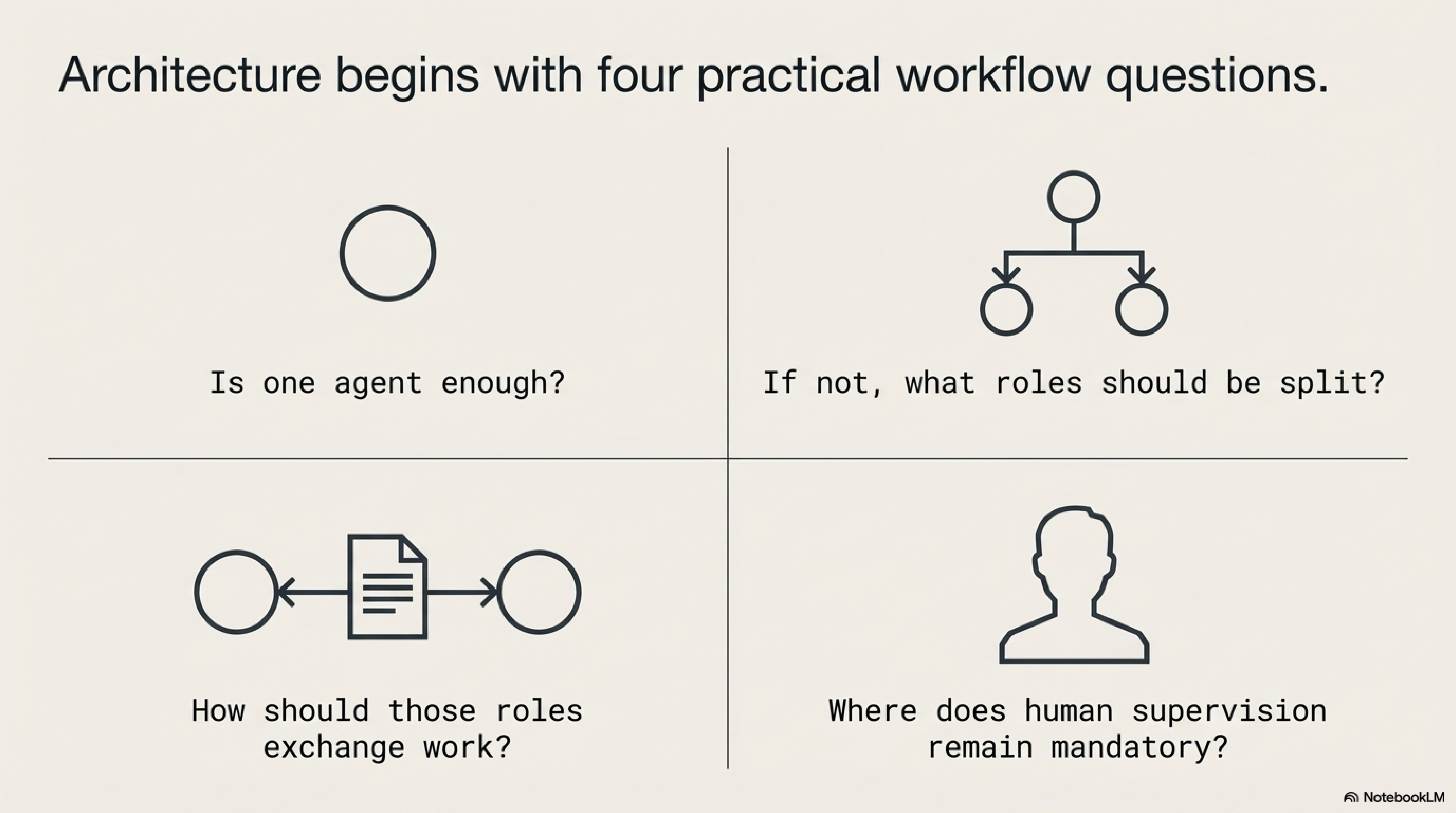One useful way to teach the topic is to reduce it to four questions. Is one agent enough. If not, what responsibility should actually be split out. What artifact should carry the handoff between roles. Where must a human remain part of the approval or arbitration path. These questions are intentionally unglamorous. They force the design back into systems engineering, where a split must buy something concrete such as narrower permissions, clearer role ownership, cleaner review, or easier debugging.