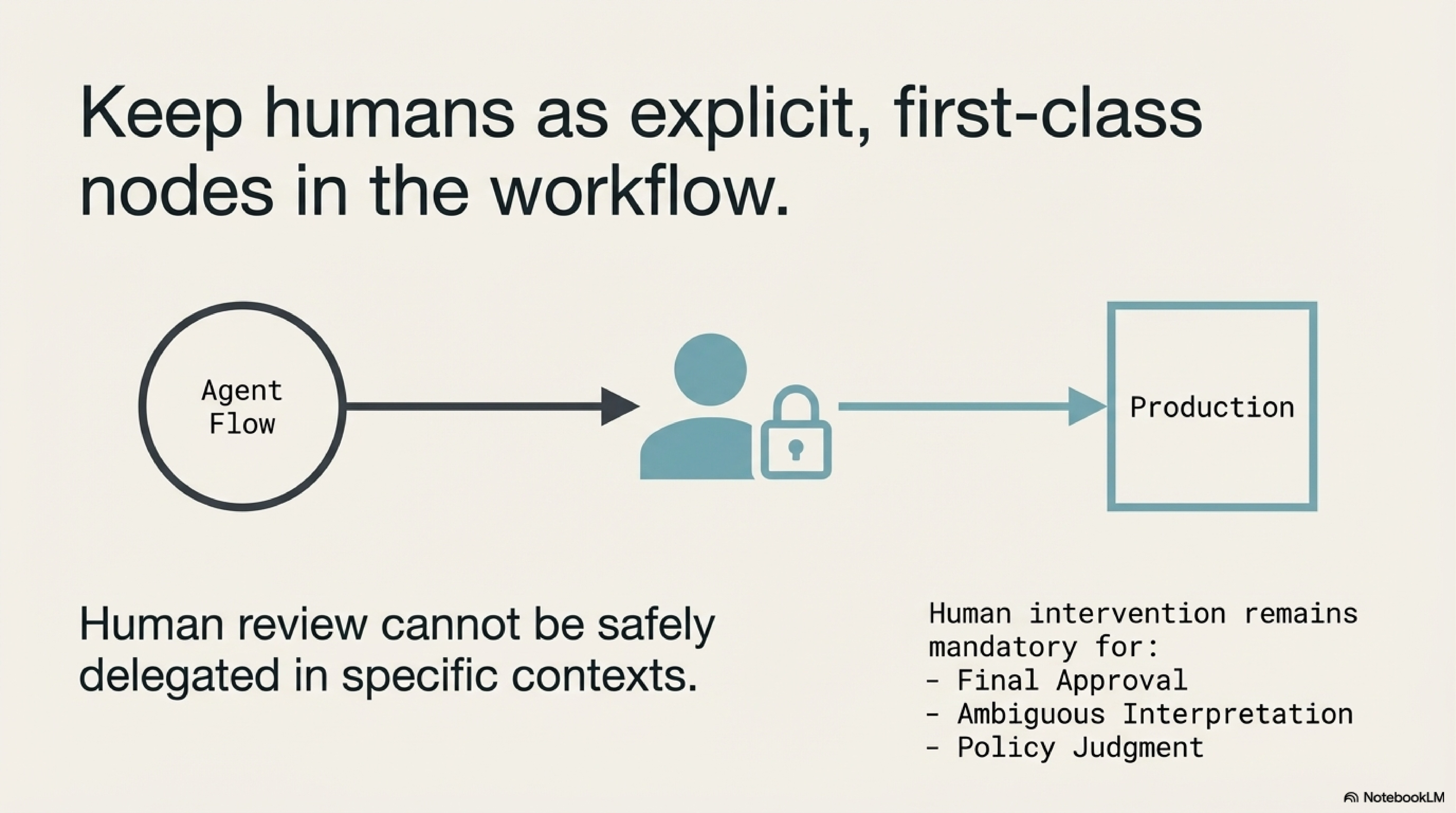 Human supervision belongs on the ladder as well. In multi-agent systems the human is not simply the old worker being gradually removed from the loop. In many workflows the human becomes the highest-clearance reviewer, arbiter, or approval node. That role is especially important when the system crosses policy, financial, or reputational boundaries. If the architecture cannot present a human with a clear artifact to inspect, approve, or reject, then the topology has failed one of its main design obligations.