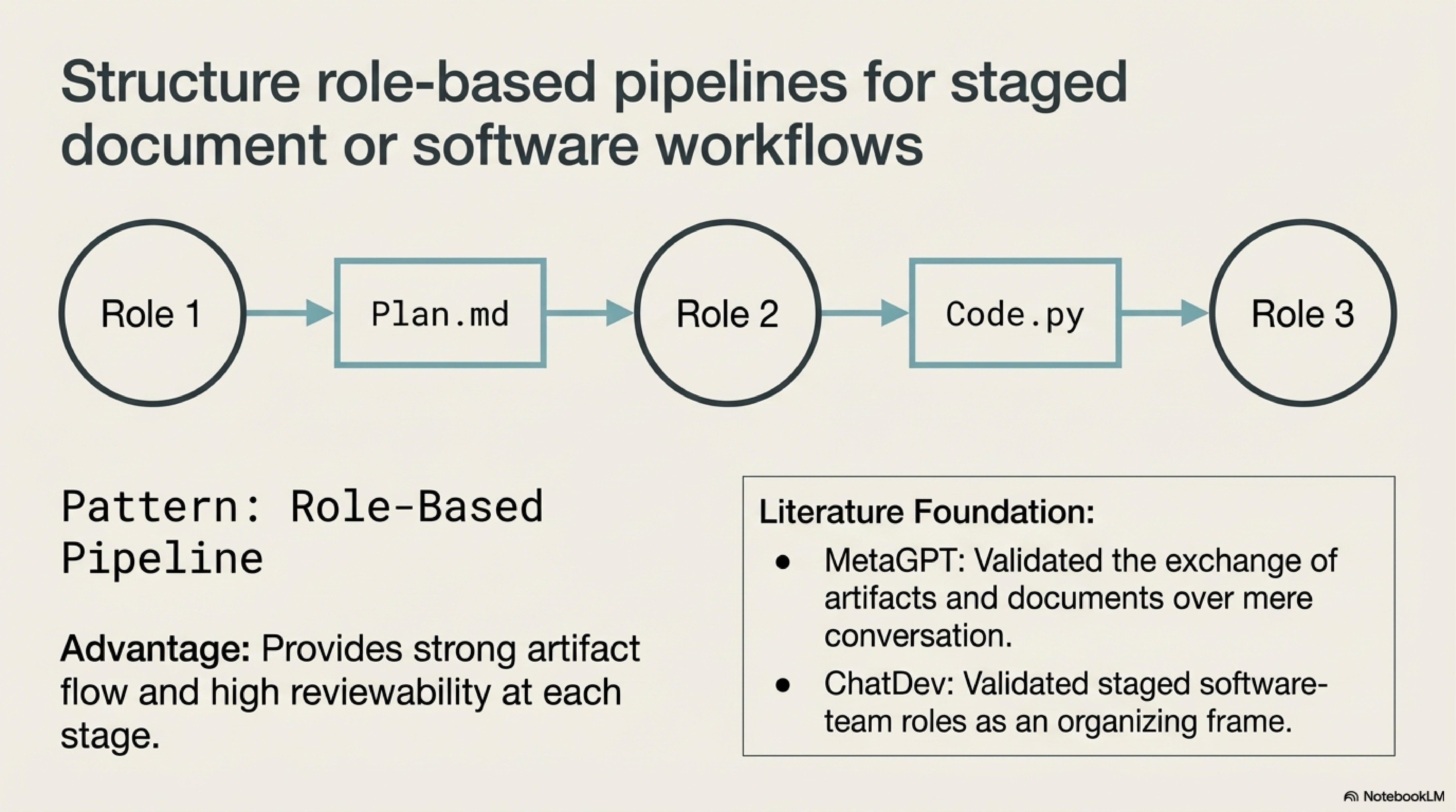 This is where the literature becomes useful. MetaGPT, ChatDev, and AutoGen are often grouped together under "multi-agent systems," but they teach slightly different lessons. MetaGPT and ChatDev are easiest to learn from when read as staged artifact pipelines: plan, implement, review, package. AutoGen is helpful as programmable orchestration fabric, but it should also be read as a warning that unconstrained inter-agent conversation is not a substitute for careful interface design. The shared insight is that the split only becomes valuable when the intermediate artifact is inspectable and role-specific.