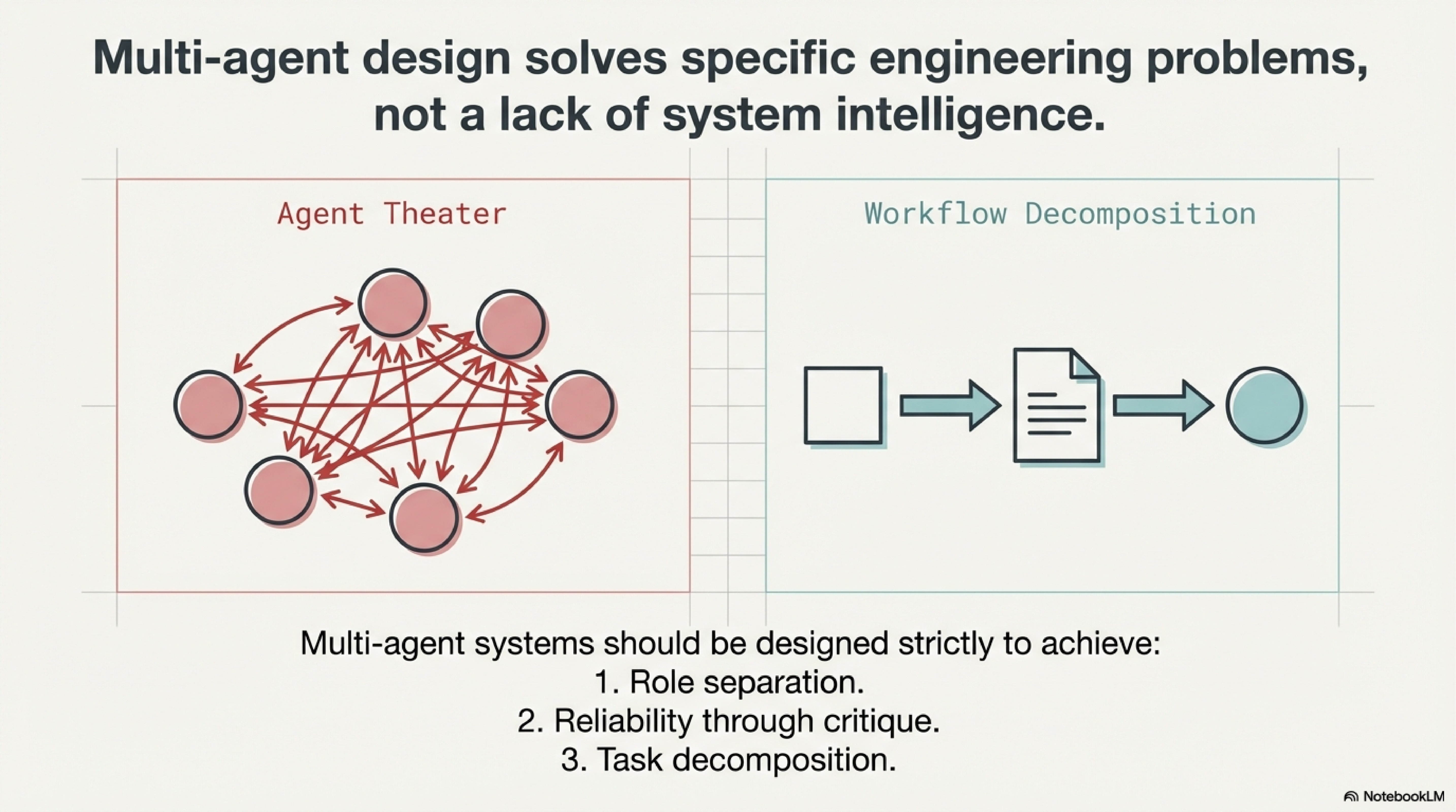The broader lesson is less dramatic than the industry story but more useful for a course chapter. Multi-agent systems are not mini-companies made of prompts. They are workflows with additional boundaries. If those boundaries do not create cleaner role separation, stronger review, safer permissions, or easier debugging, then the architecture has not matured. It has only multiplied the places where confusion can live.